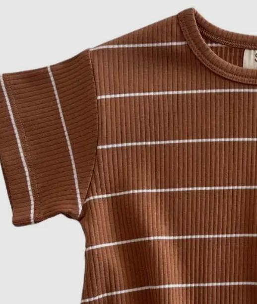This SIIX collection piece is a short sleeve ribbed bubble romper made for those early fall days, when you need to add a little fall color, but it's not quite cold out just yet. The snaps along the inseam offer easy diaper changing.